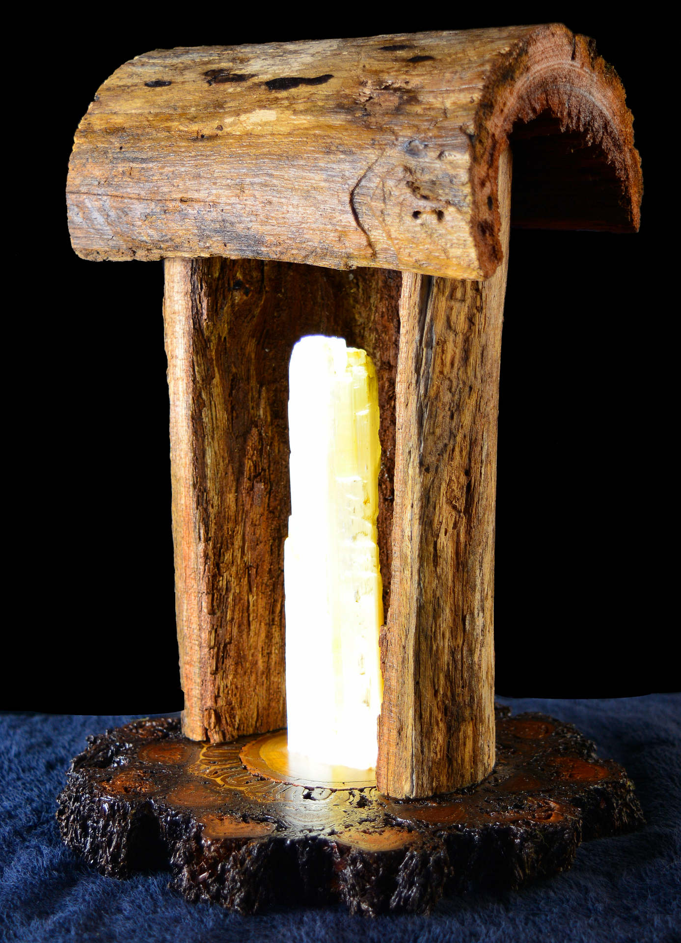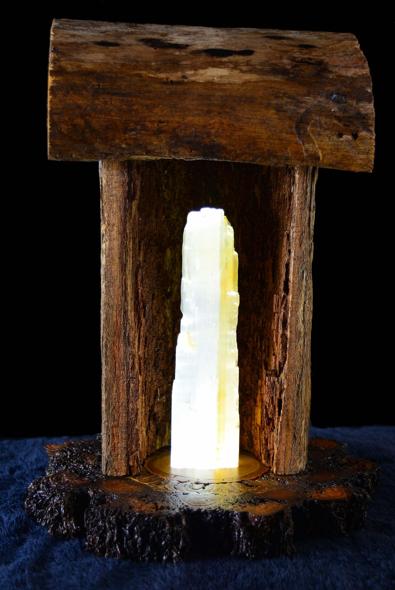 This piece is a cottage styled to reflect old Australia left with a naturally coloured finish to highlight the age and decomposition of the wood. It is capped with the same timber to enclose the piece and is placed on a fern tree base. It is showcased by a mountainous spear of Australian Selenite that glows like a laser that shows the natural finish off to it’s best effect. The light is provided by very low wattage L.E.D’s and it comes with an Australian standard transformer and on/off switch.